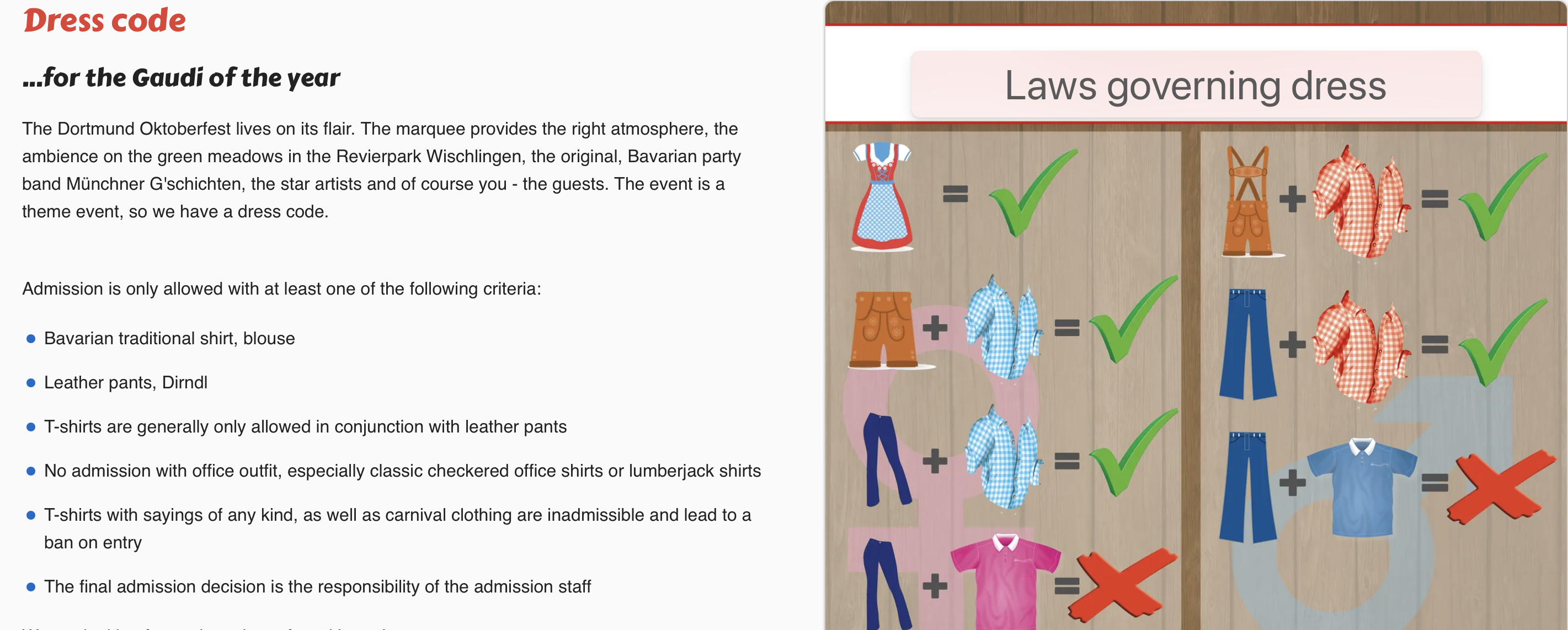 The Oktoberfest website included an FAQ and a section devoted specifically to dress code. It required a traditional Bavarian shirt or dress, but we didn’t take it too seriously and showed up in simple, solid-colored shirts and jeans.