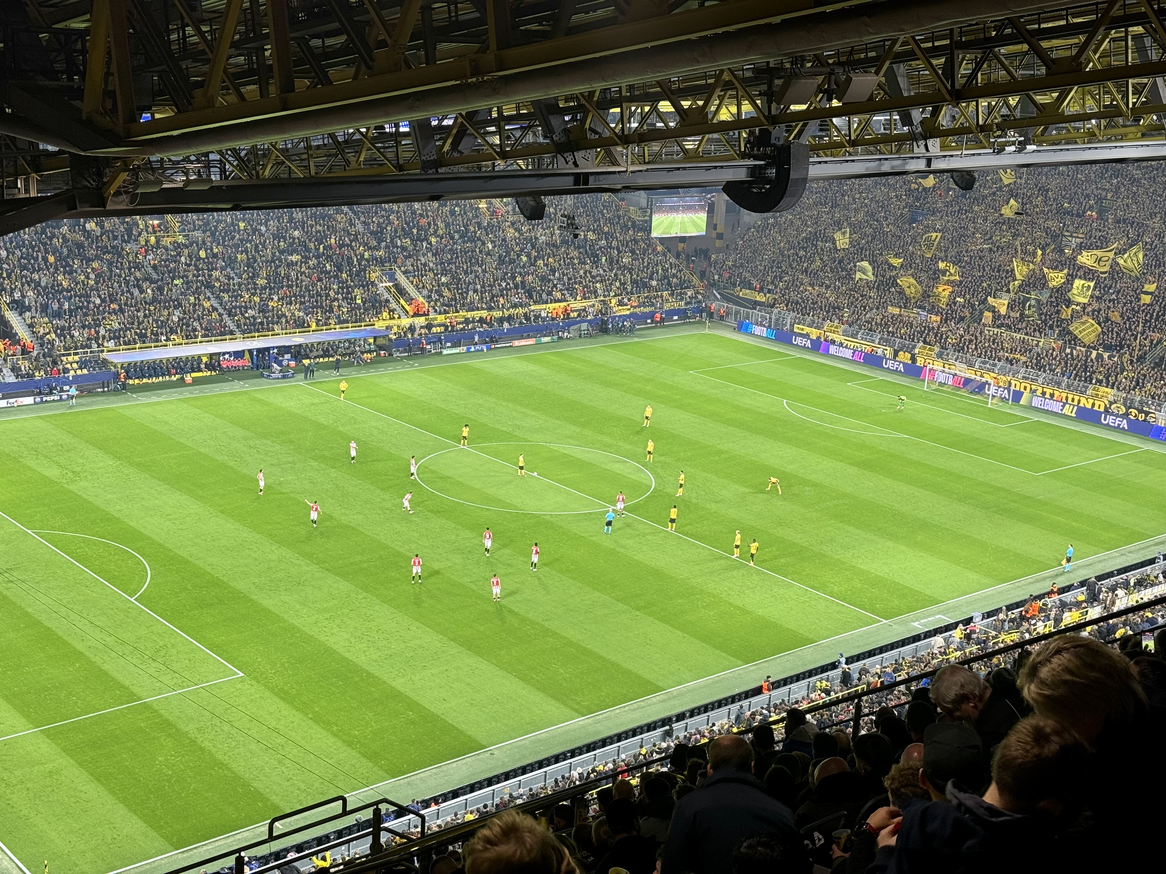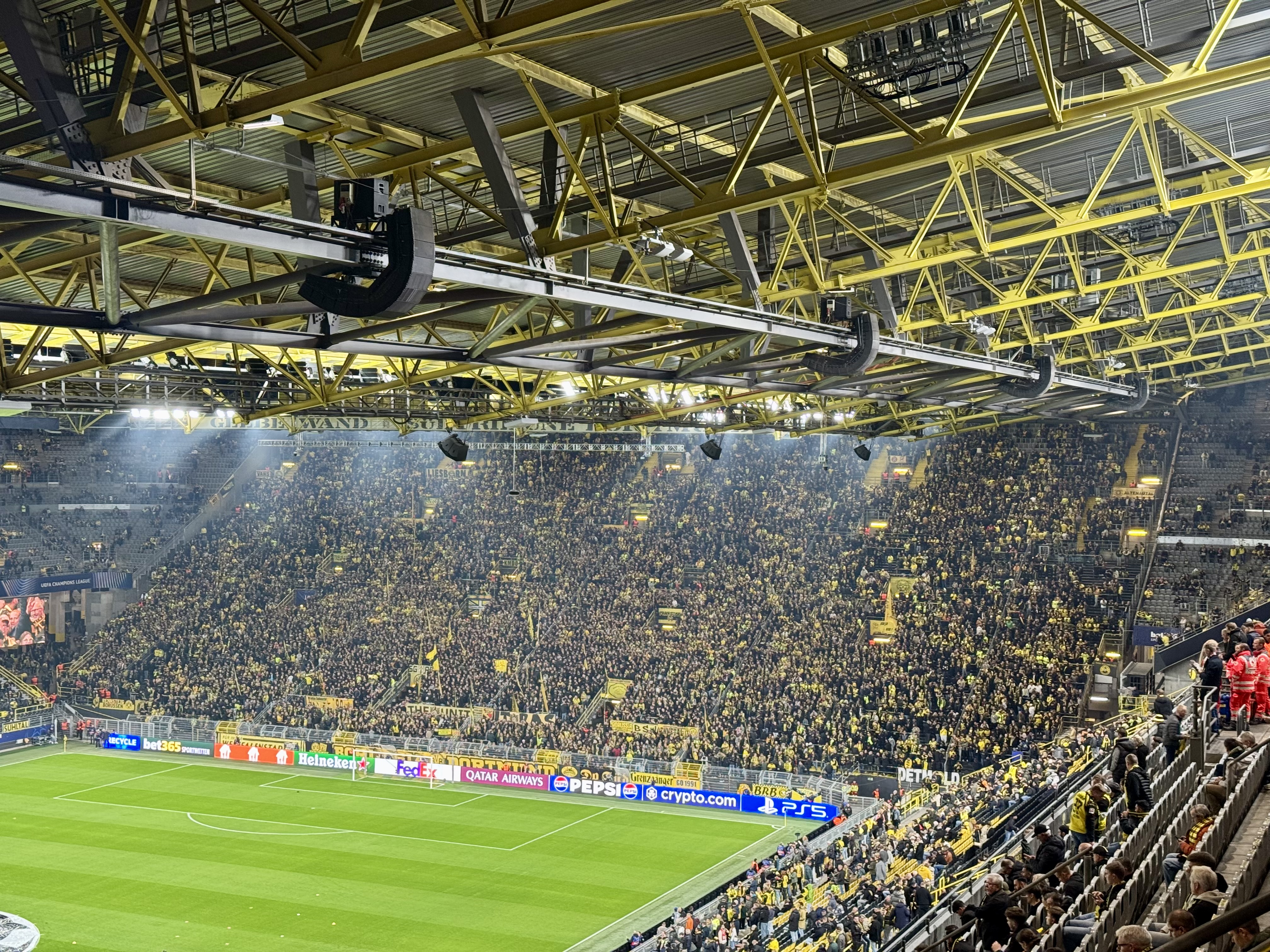 The atmosphere felt electric from the start. Fans around us cheered nonstop and waved their scarves throughout the match, while supporters in the Yellow Wall kept the energy high with signs and drums. We saw a couple goals at our end of the field too, as Dortmund won 4-1.