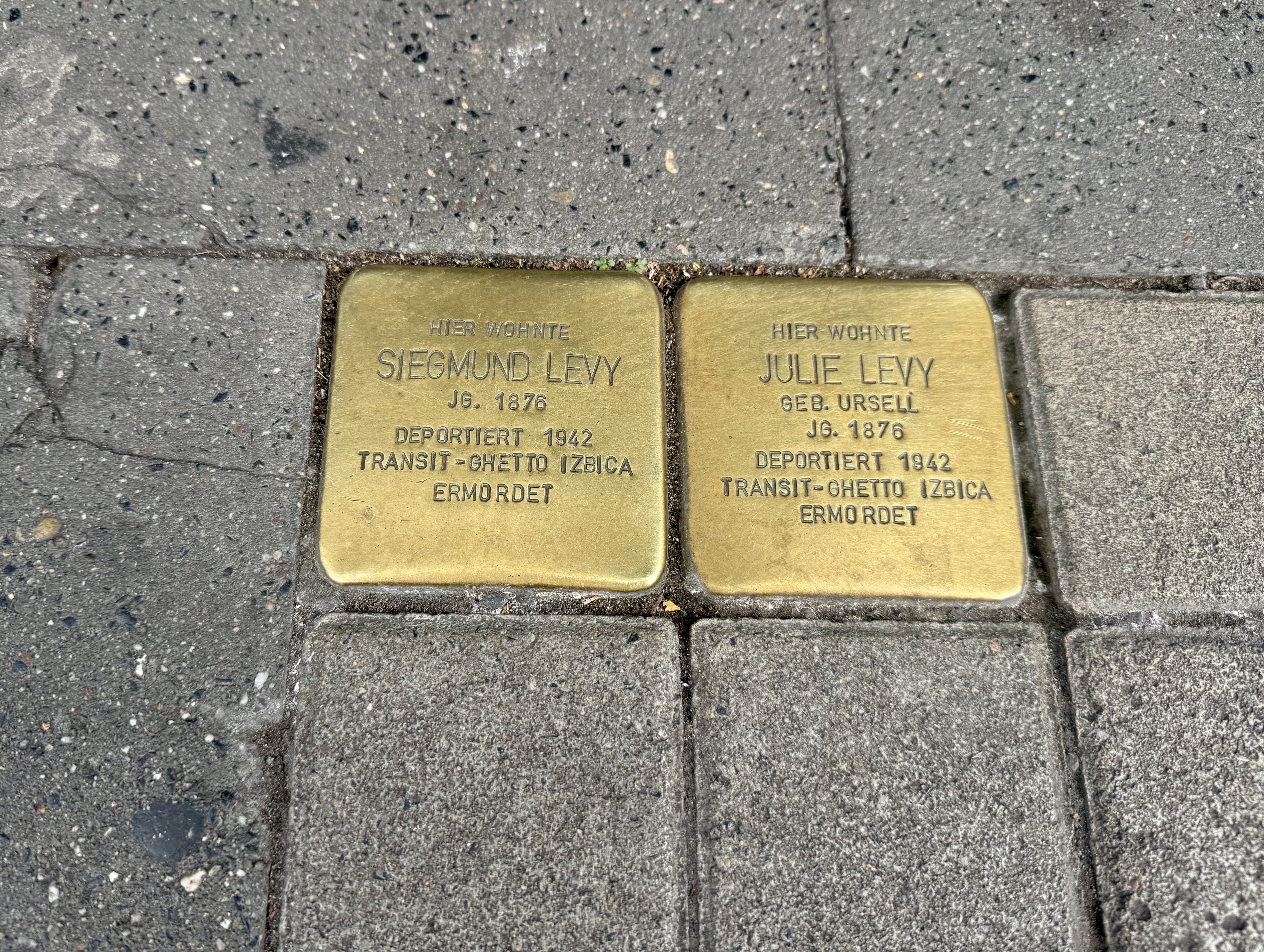 This pair was located at Friedrich-Ebert-Strasse 12, the last known residence for Siegmund & Julie Levy. Their stone translates that they were deported in 1942 to Izbica ghetto in Poland. Further research led me to a list of Stolperstein in Düsseldorf, where I found additional information about the Levys: