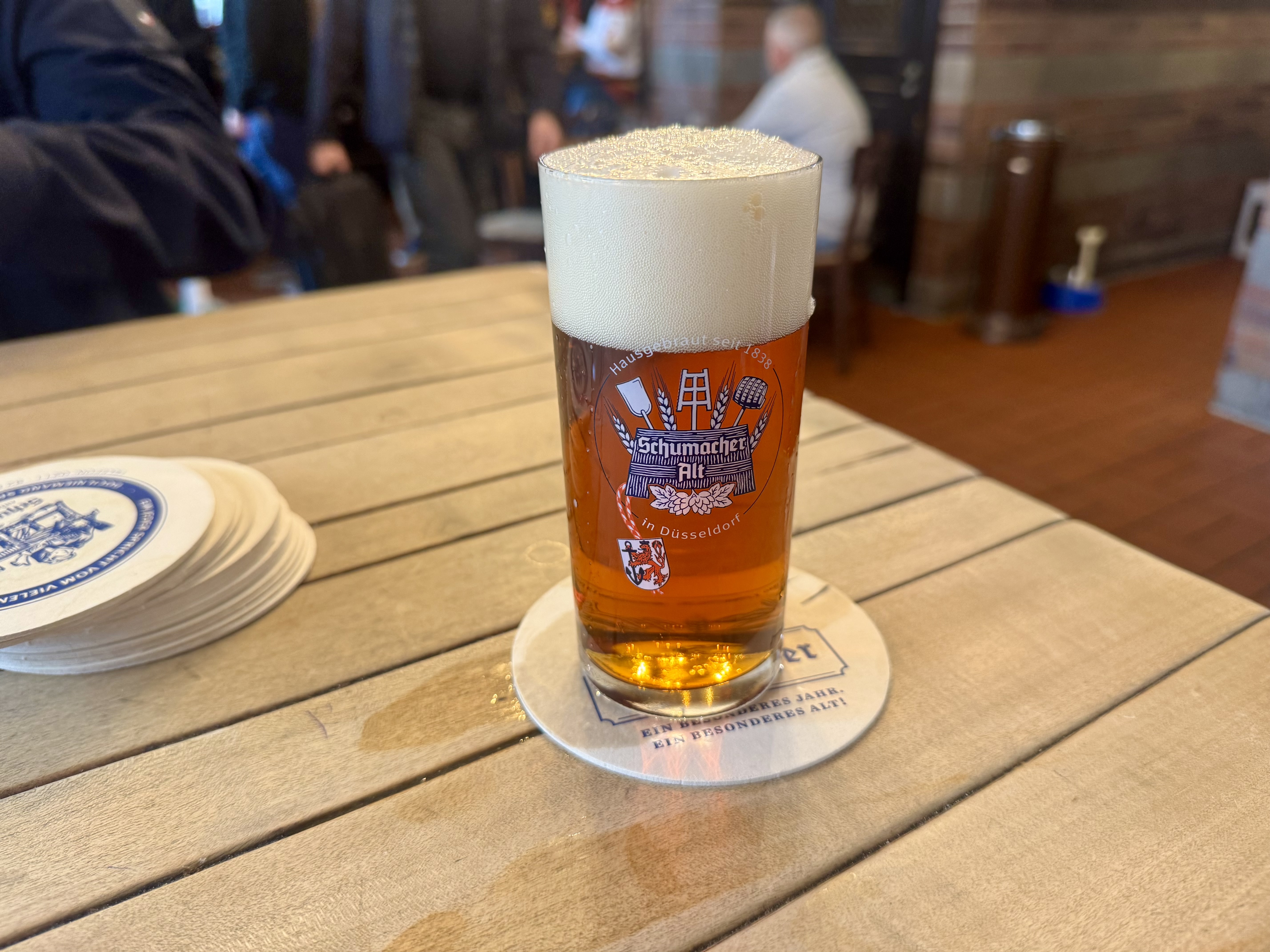 Altbier comes in the same small, cylinder glass as Kölsch, a design meant to keep the beer cold. Servers tally each drink directly on your coaster, just like in Cologne.
