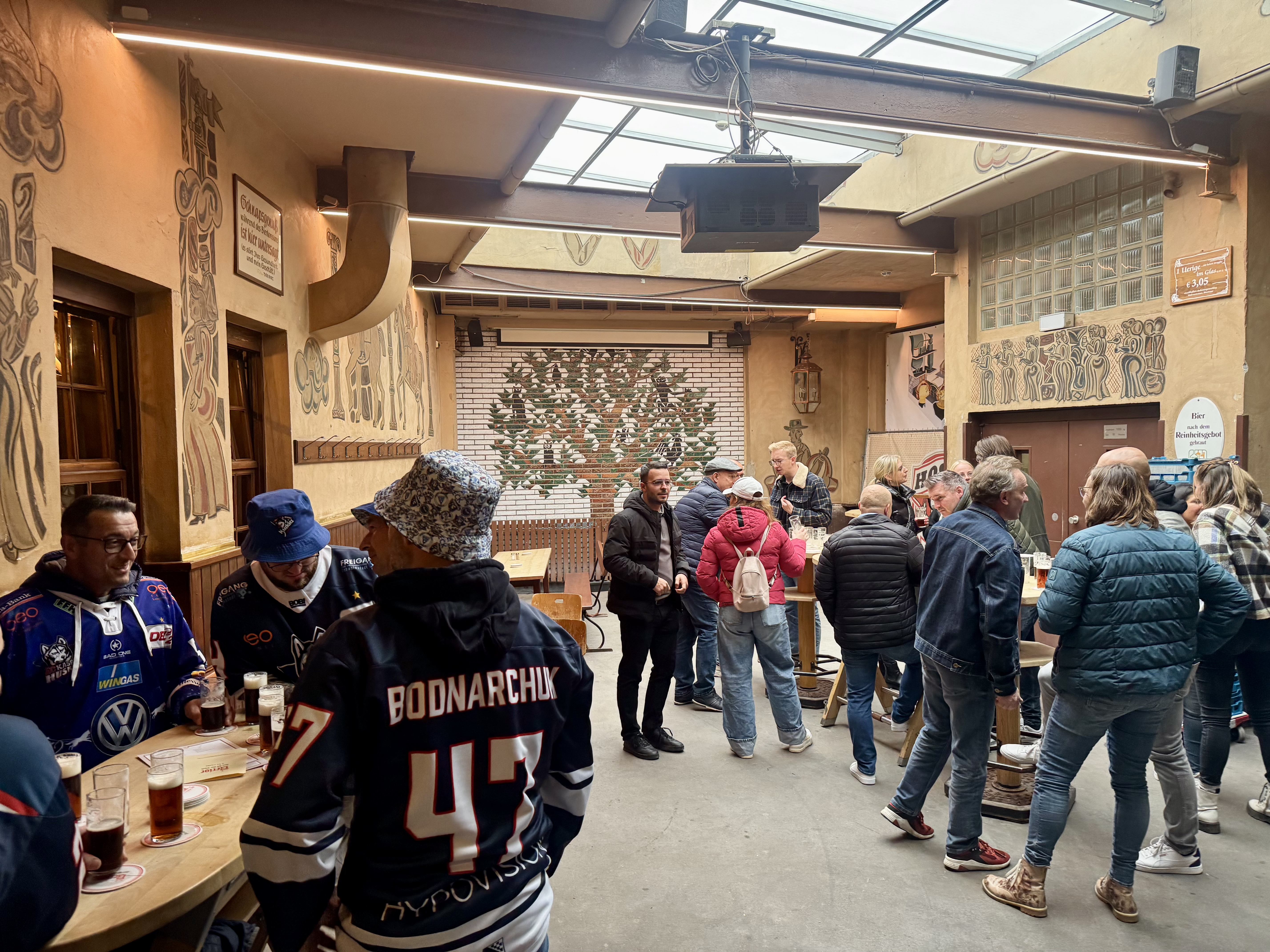 Uerige had a full dining space but we sat a beer barrel turned table in one of their side rooms that was half wood-paneled and painted murals.